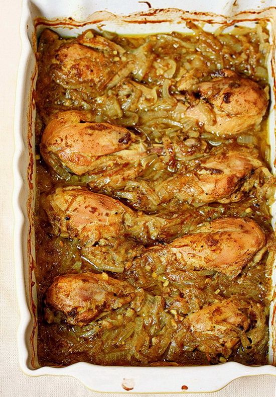 Ароматни пилешки бутчета с лук