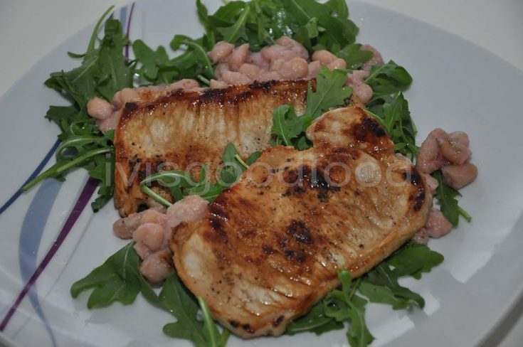 4. Пържолите се гарнират с чесновия боб и рукола.