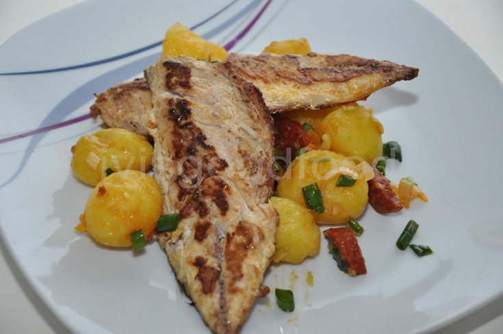Скумрия с картофи и чорисо е чудесен и здравословен избор да добавите риба към менюто си, особено ако сте на здравословен режим на хранене. Чорисо, наричано също и чоризо е пикантен колбас от свинско месо, произхождащ от Испания и Португалия. Този колбас придава наистина леко парлив, пикантен вкус към ястието.